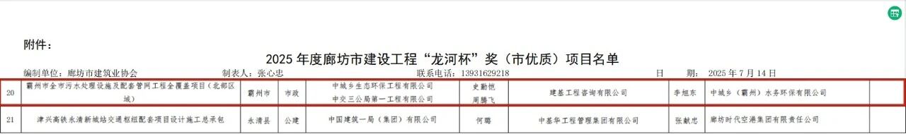 近日,河北省廊坊市建筑业协会公示了《关于公布2025年度廊坊市建设工程“龙河杯”奖(市优质)工程项目名单的通知》,公司监理的霸州市全市污水处理设施及配套管网工程全覆盖项目(北部区域),凭借高标准的质量管控体系与创新实践的管理模式成功入选,荣膺廊坊市优质工程“龙河杯”奖。