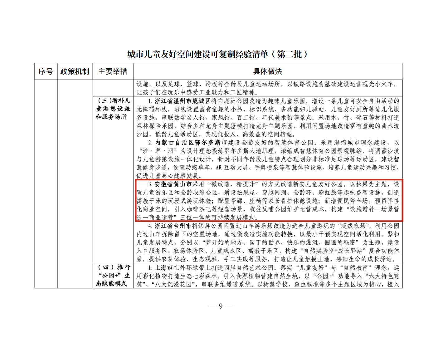 近日,住房城乡建设部办公厅、国家发展改革委办公厅、国务院妇女儿童工作委员会办公室印发《城市儿童友好空间建设可复制经验清单(第二批)》,——由公司监理的黄山市中心城区城市更新基础设施补短板期工程EPC(工程总承包)的重要组成部分黄山市“新安儿童友好公园”改造项目成功上榜,成为全省唯一入选案例。